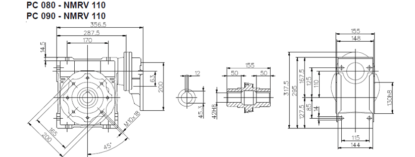Цилиндро-червячный мотор-редуктор серии PCRV состоит из червячного редуктора NMRV и цилиндрической ступени PC. В отличии от редукторов NMRV цилиндрическая ступень имеет только одно значение передаточного отношения (3,5). Ступень PC поставляется в четырех типоразмерах: PC 63, PC71, PC80, PC90. Ступень устанавливается между электродвигателем и редуктором и позволяет получить диапазон передаточных чисел 75 – 320. Корпус из алюминиевого сплава. Шестерни выполнены из закаленного сплава 20MnCr5 (UNI7846).